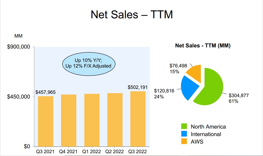 През третото тримесечие на 2022 г. приходите от 127,1 милиарда долара са нараснали с 15%, докато коригираната печалба на акция от 0,28 долара надхвърля прогнозите с 0,07 долара на акция. По сегменти, продажбите в Северна Америка се увеличиха с 20%, докато международните продажби се увеличиха с 12%. Продажбите на AWS се увеличиха с 27% на годишна база.